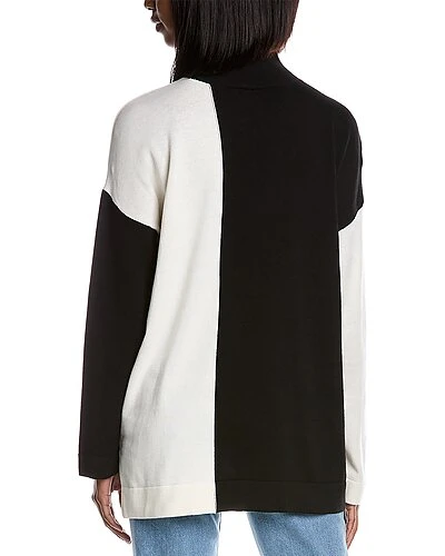 - Colorblock Sweater in black and white with mock neck, dropped-shoulder sleeves, and slits at hem