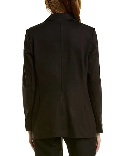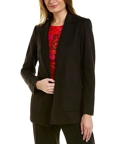 - Compression Blazer in black with notch collar, dual front pockets, open front