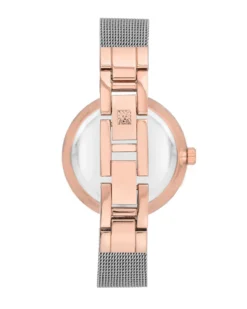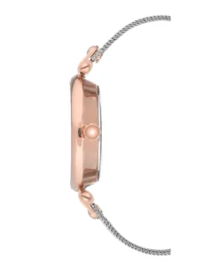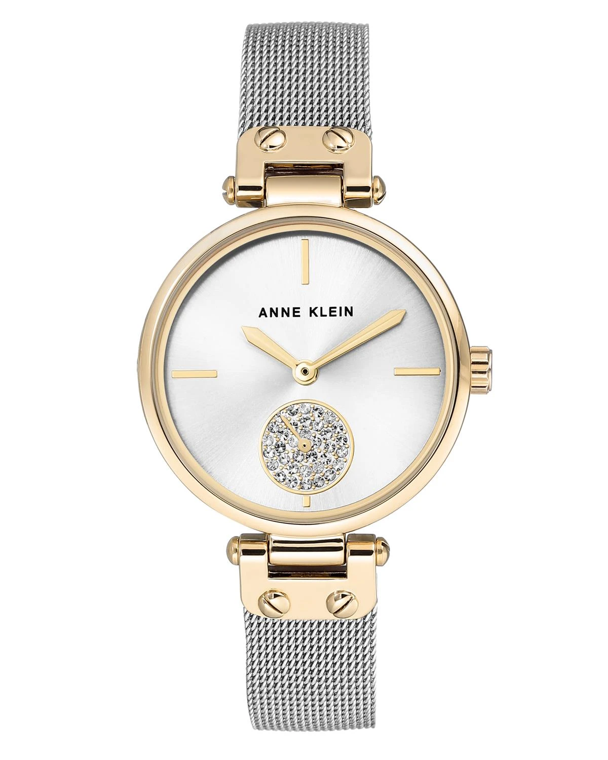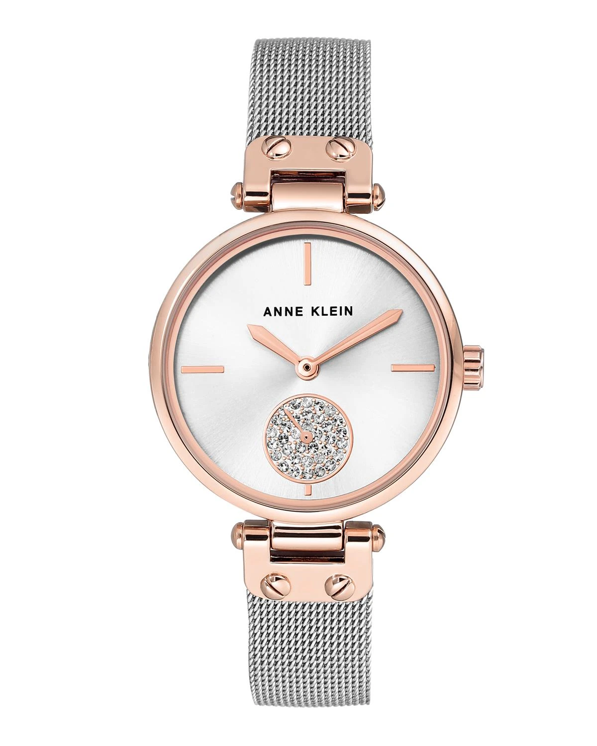A marvelous mesh bracelet and sparking crystal accents make a watch by Anne Klein that’s unforgettable.