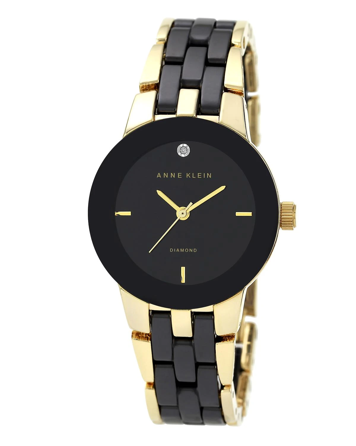 An Anne Klein classic ceramic timepiece with a genuine diamond set into the 12 o’clock position.