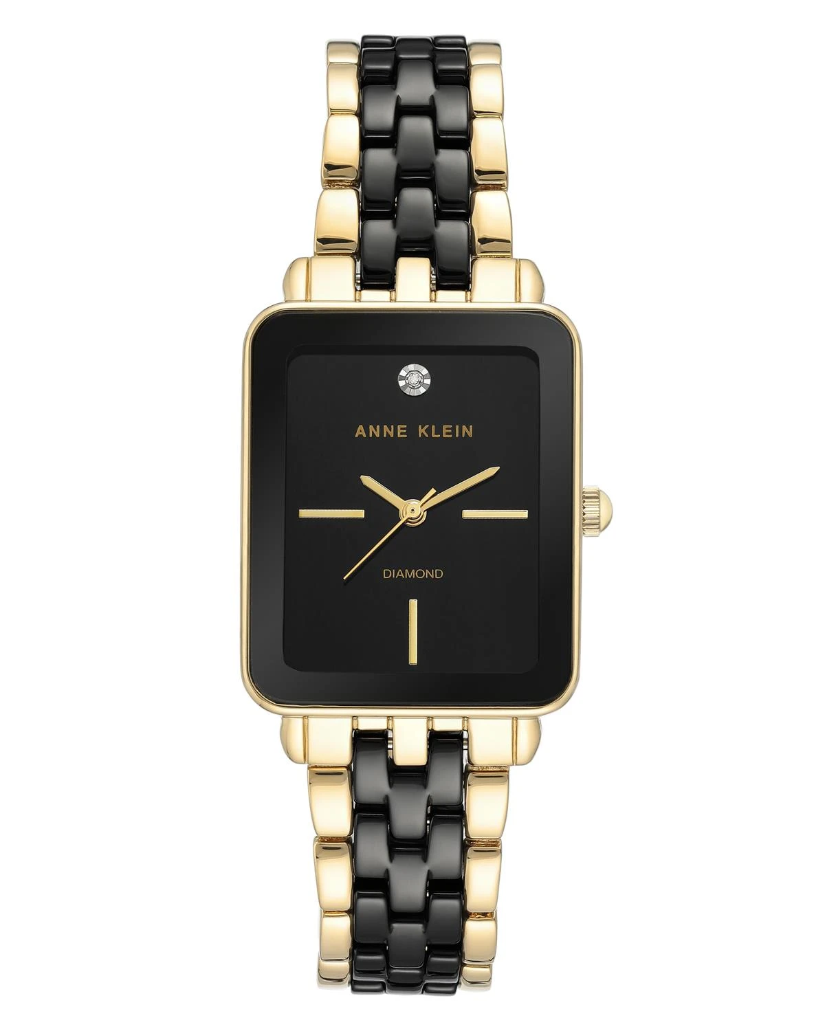 An Anne Klein classic ceramic timepiece with a genuine diamond set into the 12 o’clock position.