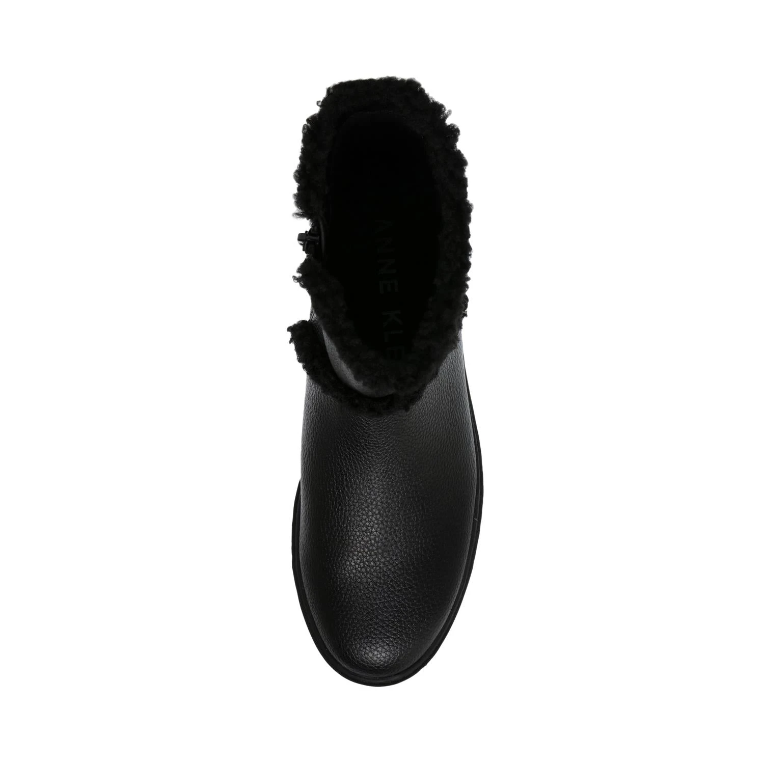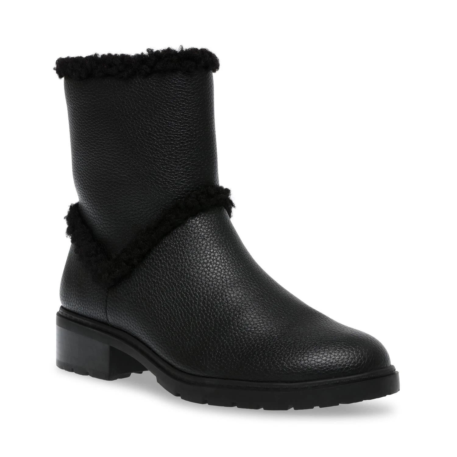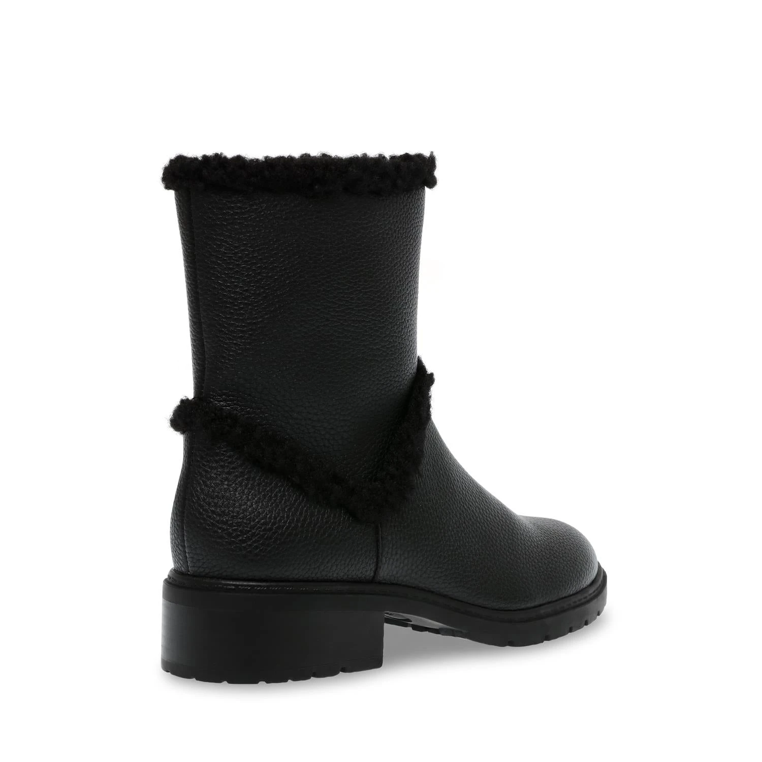 BLACK TUMBLED CALF LEATHER With faux shearling trim and LUG SOLE