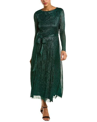 - Foil Maxi Dress in green with sheer sleeves and tie at waist