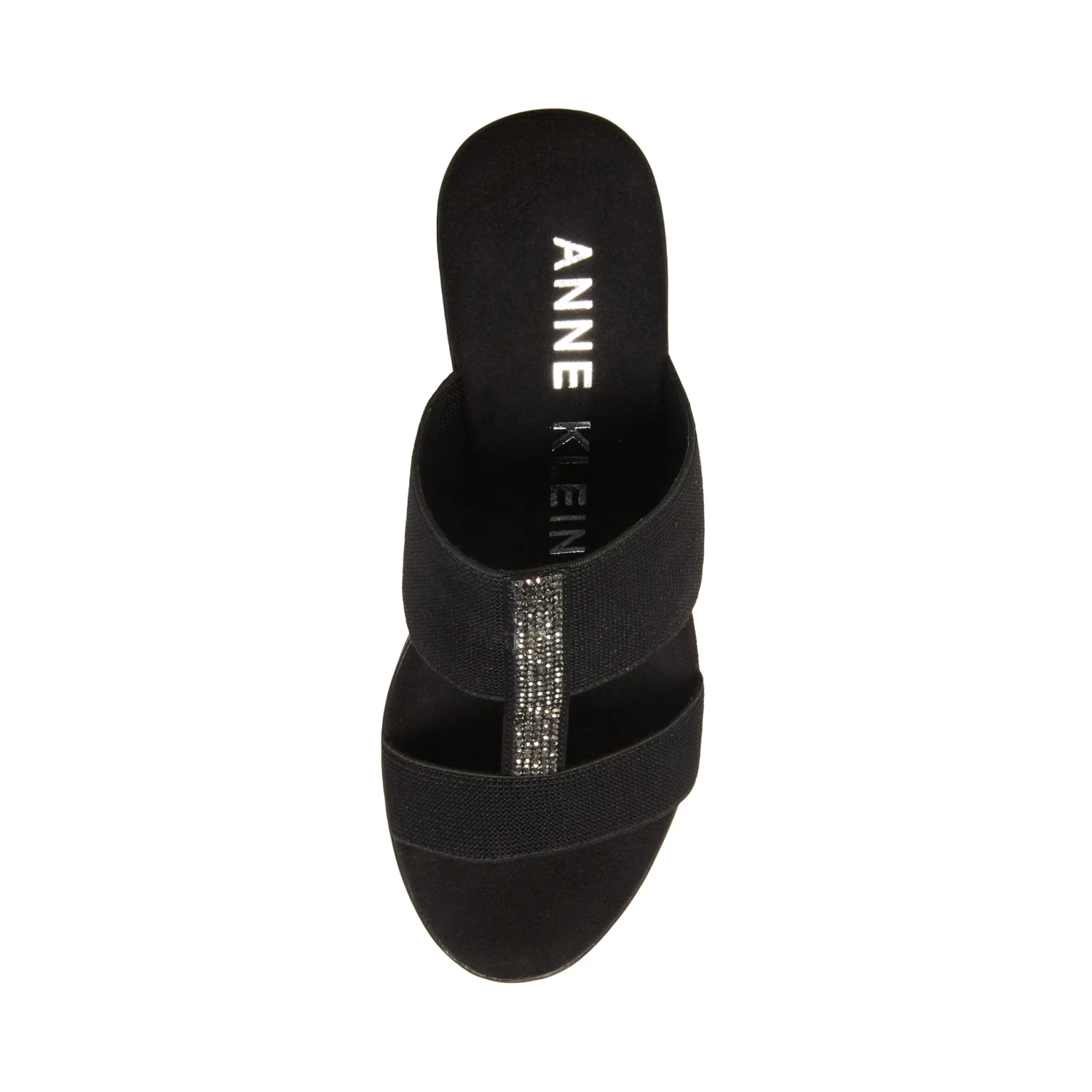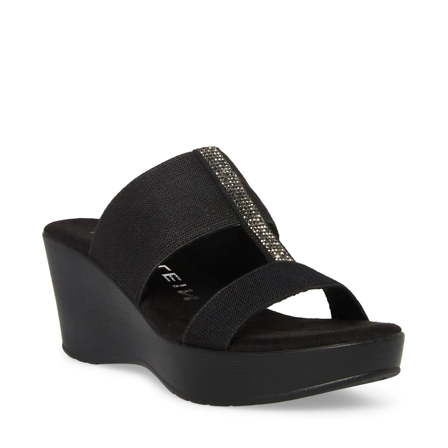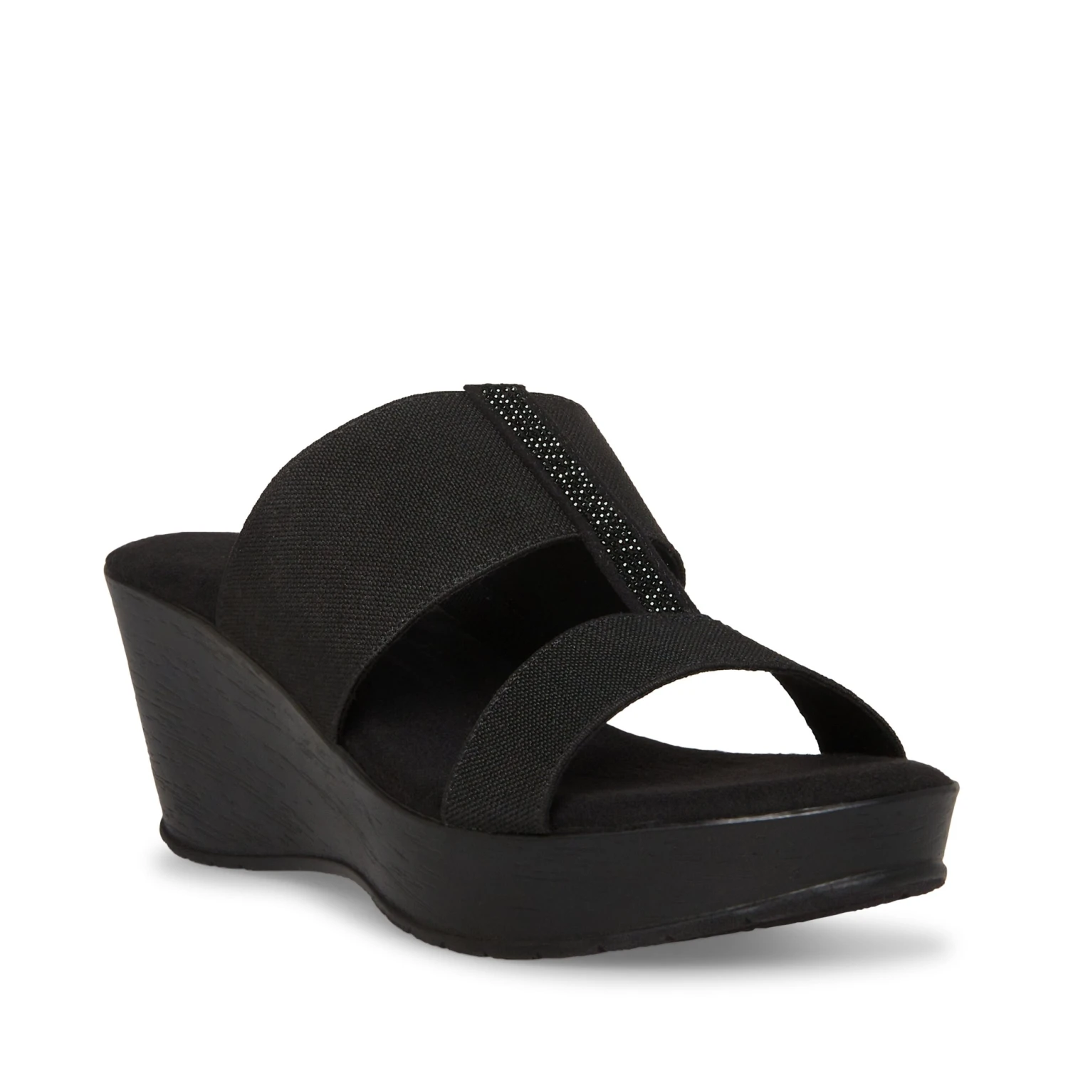An easy slip-on wedge with decorative crystal detail and comfortable stretch straps.