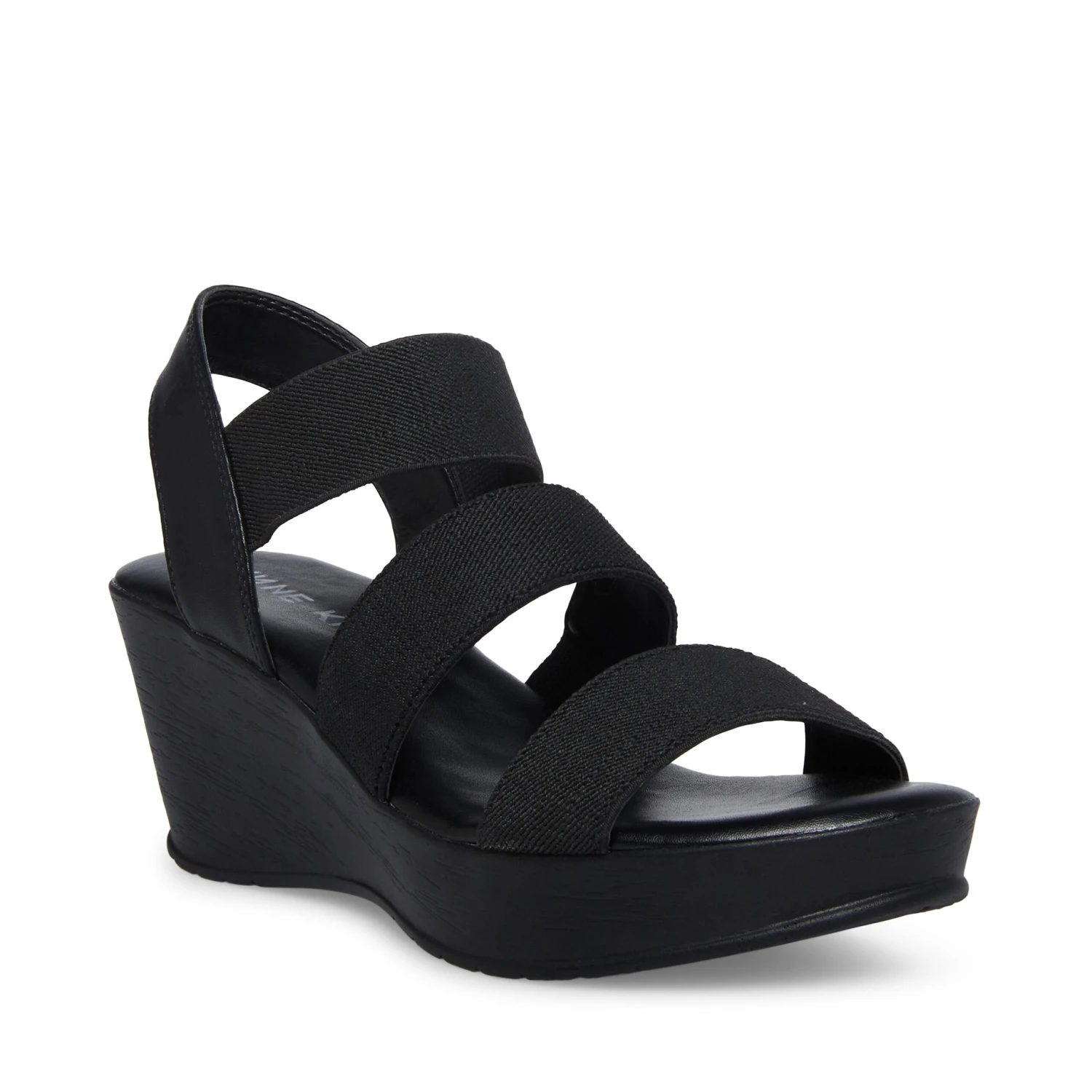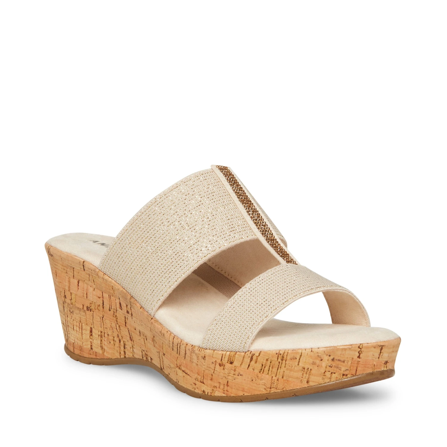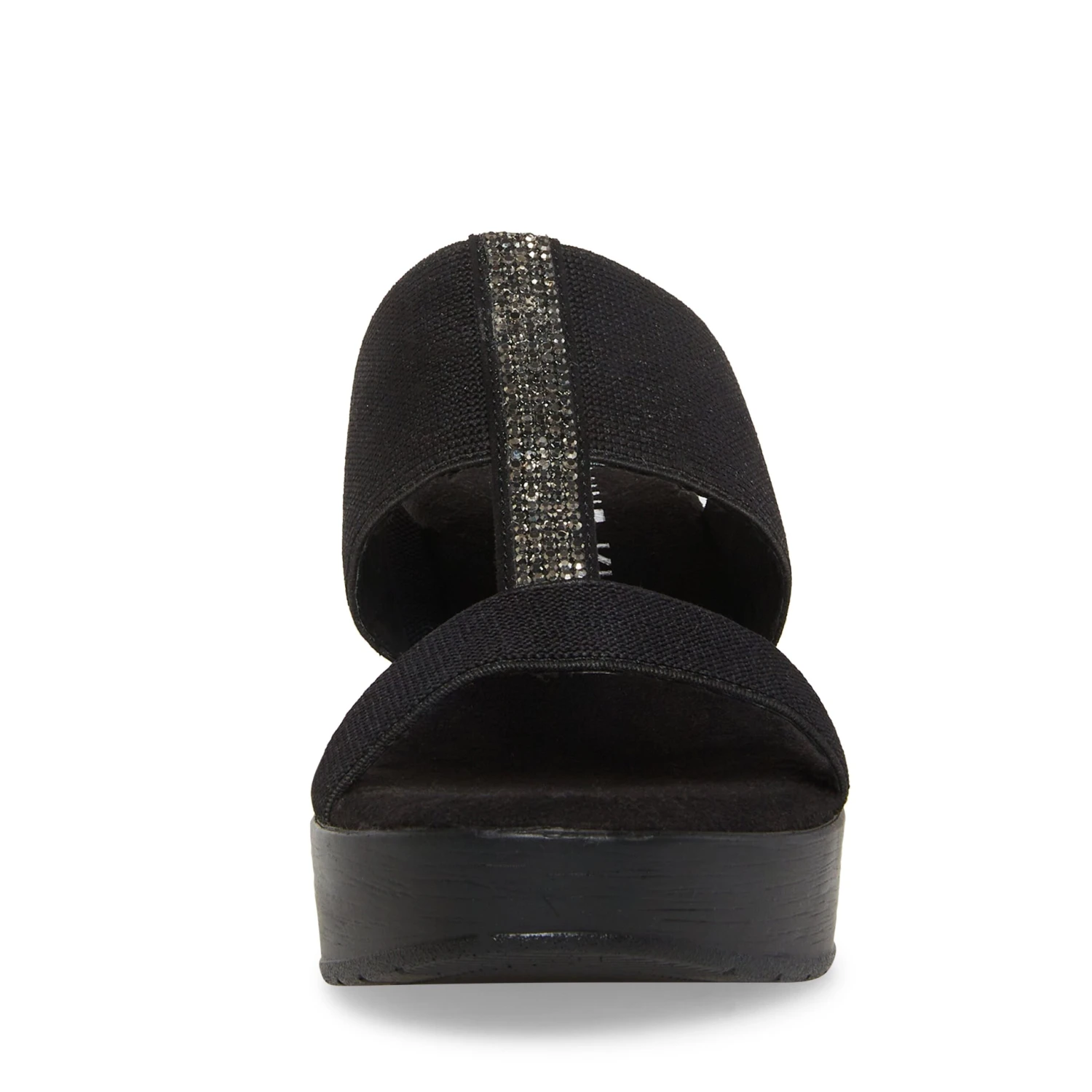 An easy slip-on wedge with decorative crystal detail and comfortable stretch straps.