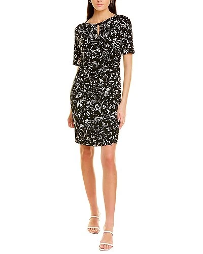 - Maryellen Midi Dress in Anne black & Anne white with bateau neck, keyhole surplice neck, elbow-length sleeves, and pleated left waist