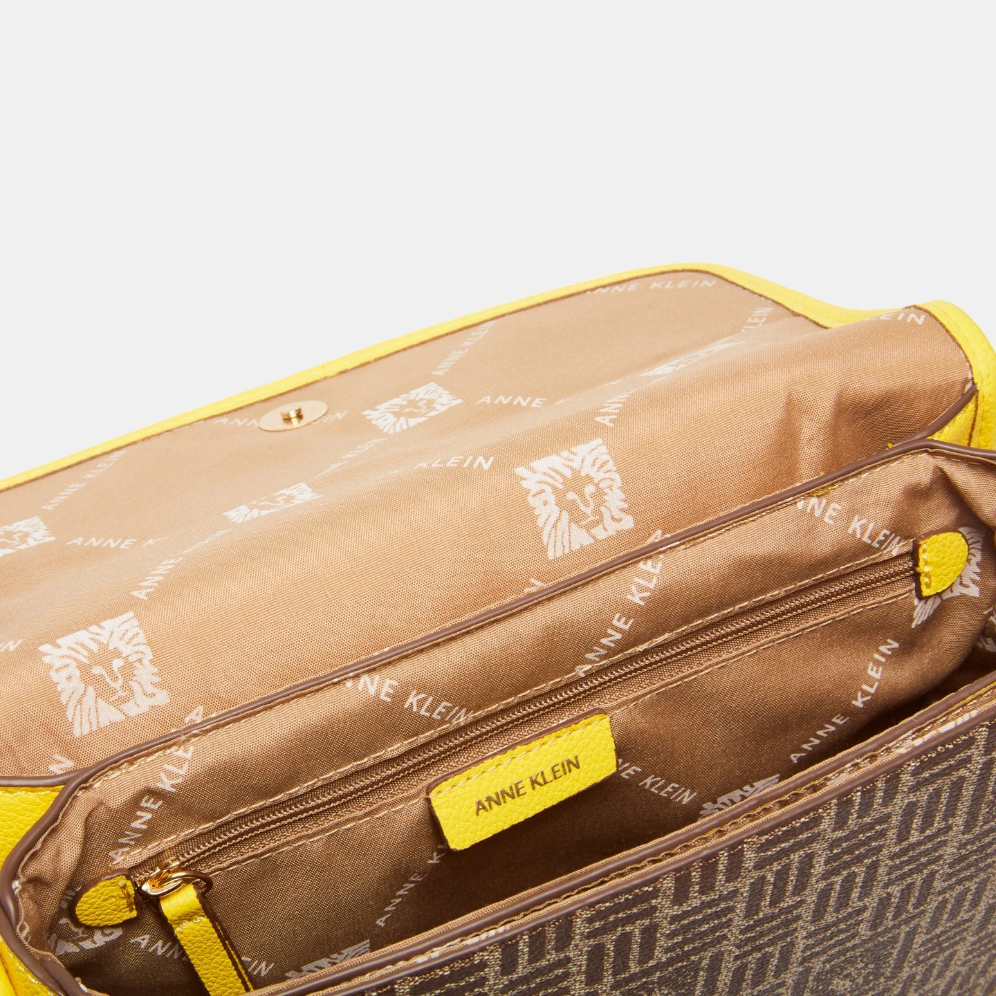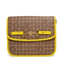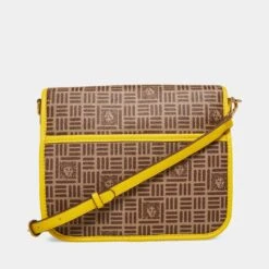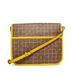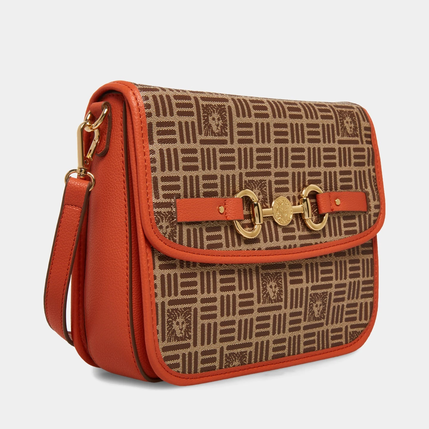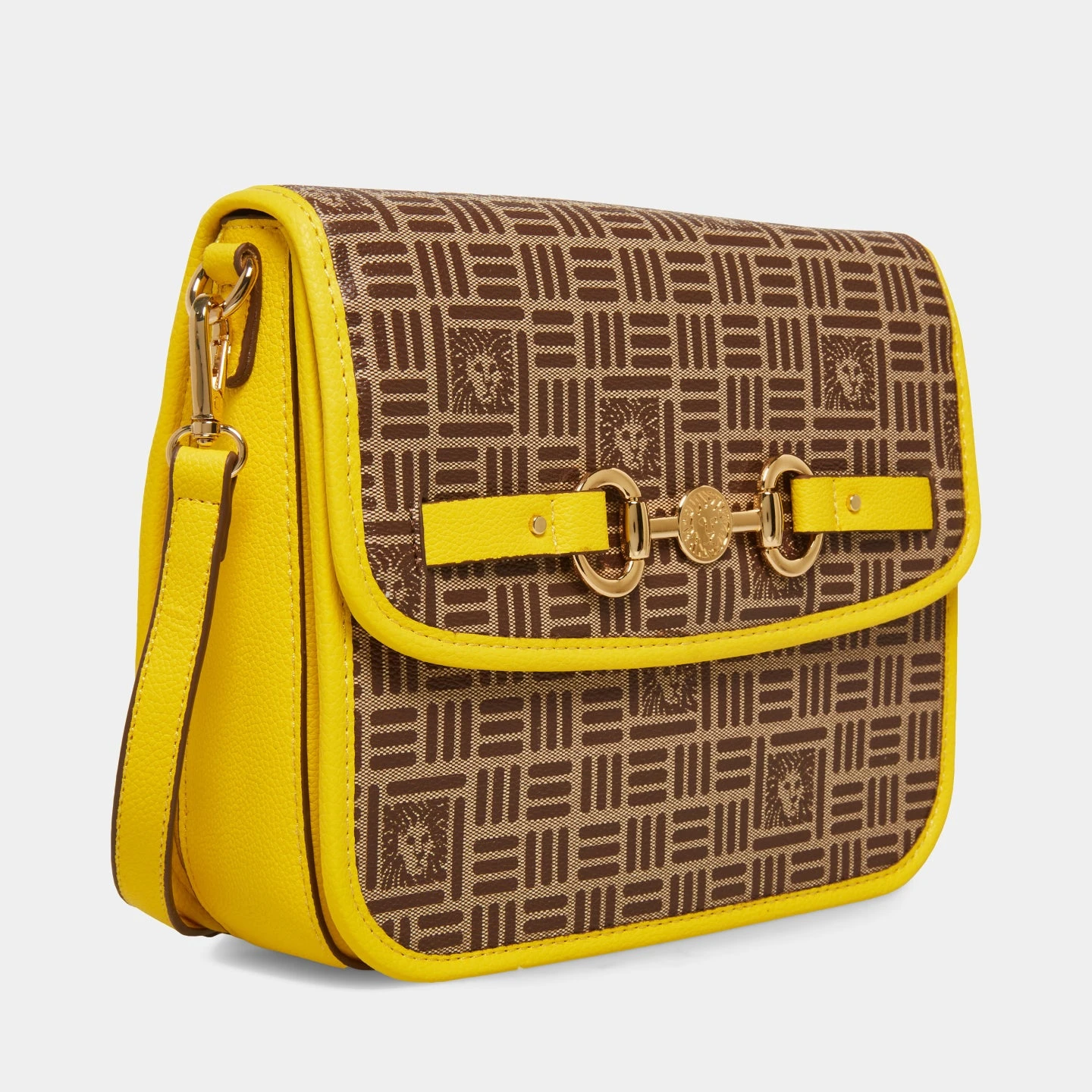 Our cream brown tile lion logo flap crossbody has hit the ground running and is now available in multiple new dashes of colors including desert rose, dandelion yellow distant mountain navy. This bag comes with multiple compartments for added organization.