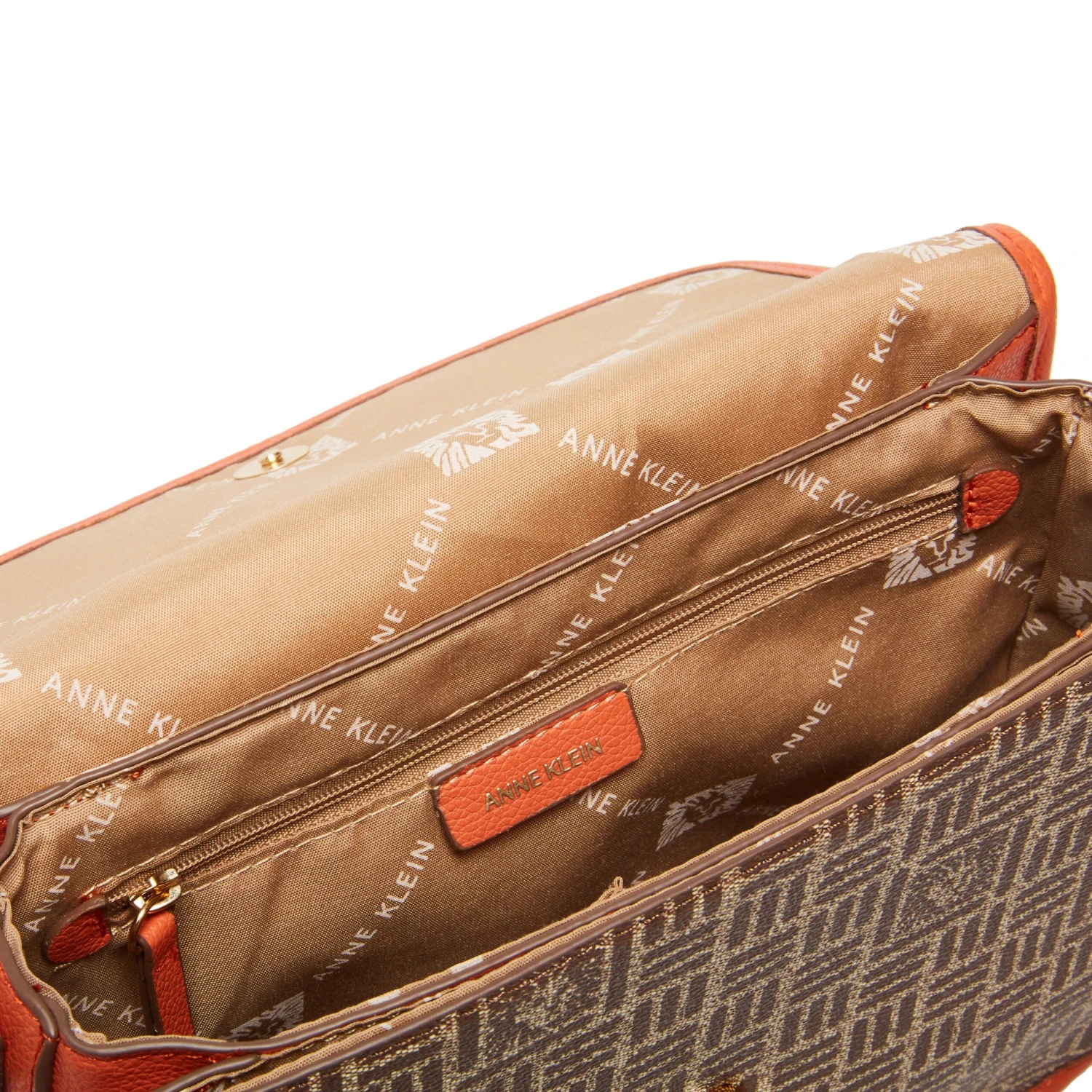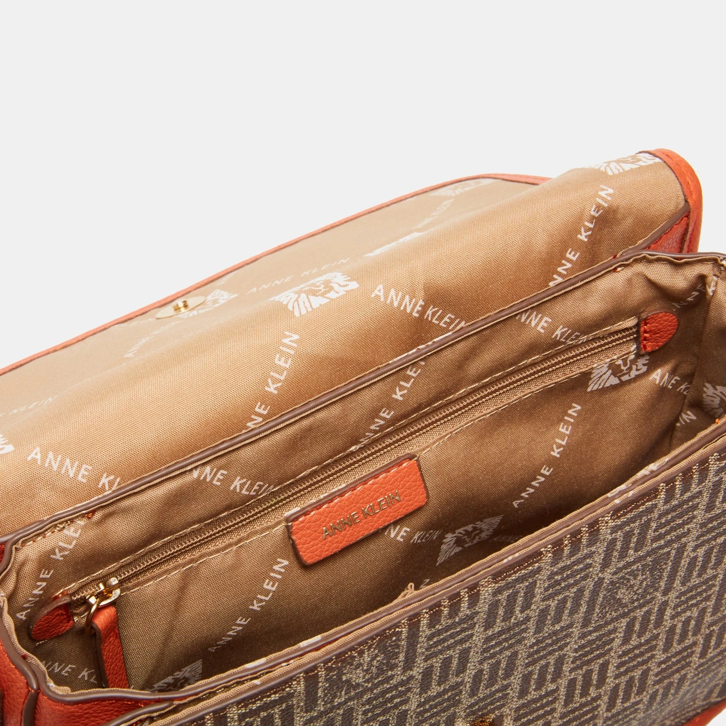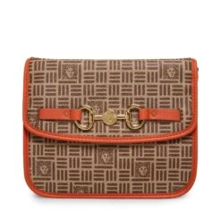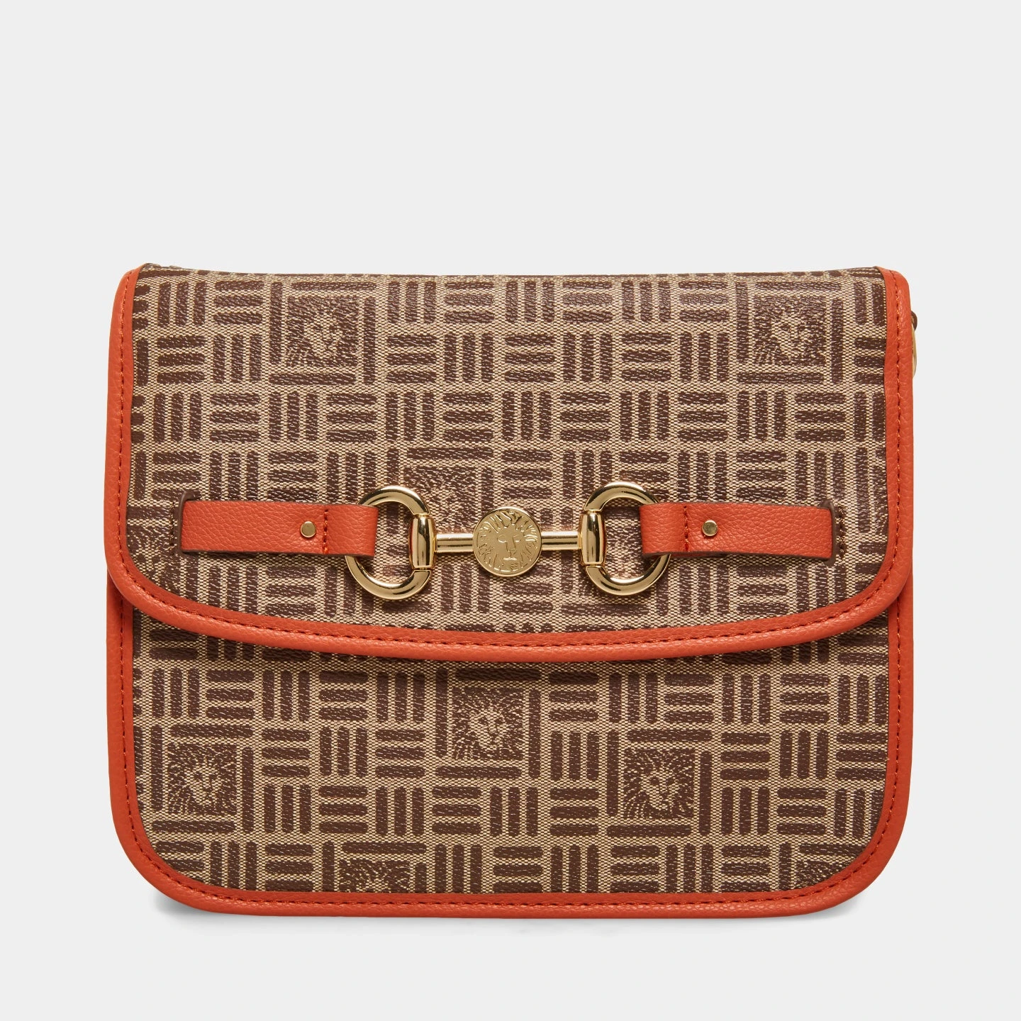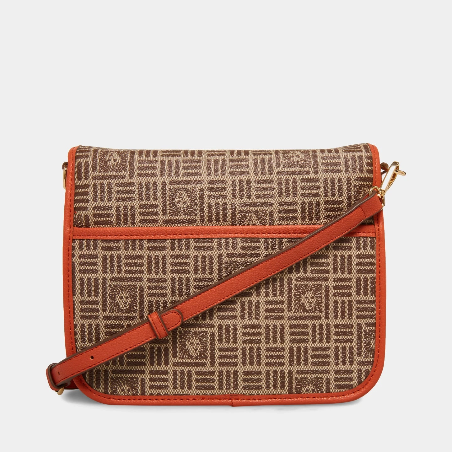 Our cream brown tile lion logo flap crossbody has hit the ground running and is now available in multiple new dashes of colors including desert rose, dandelion yellow distant mountain navy. This bag comes with multiple compartments for added organization.