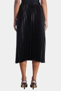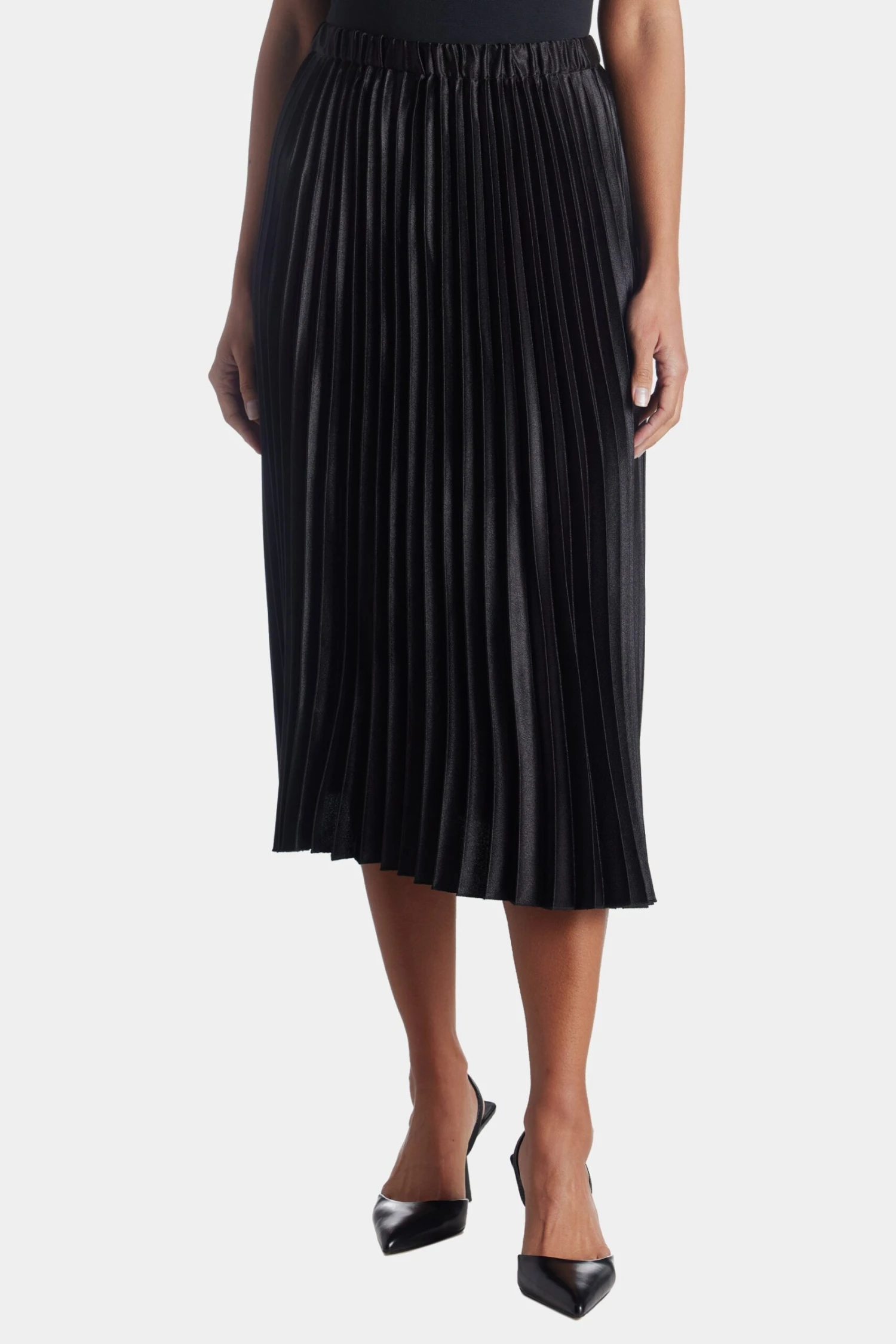 - Satin crepe fabrication; knife pleats; elastic waistband; unlined; skirt length 30 1/2-inches (size pm)