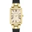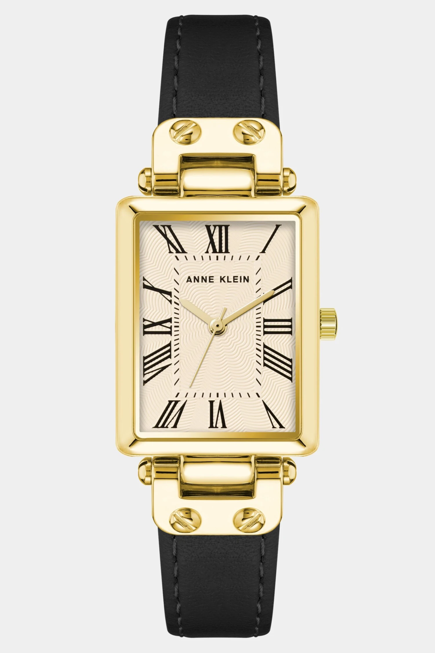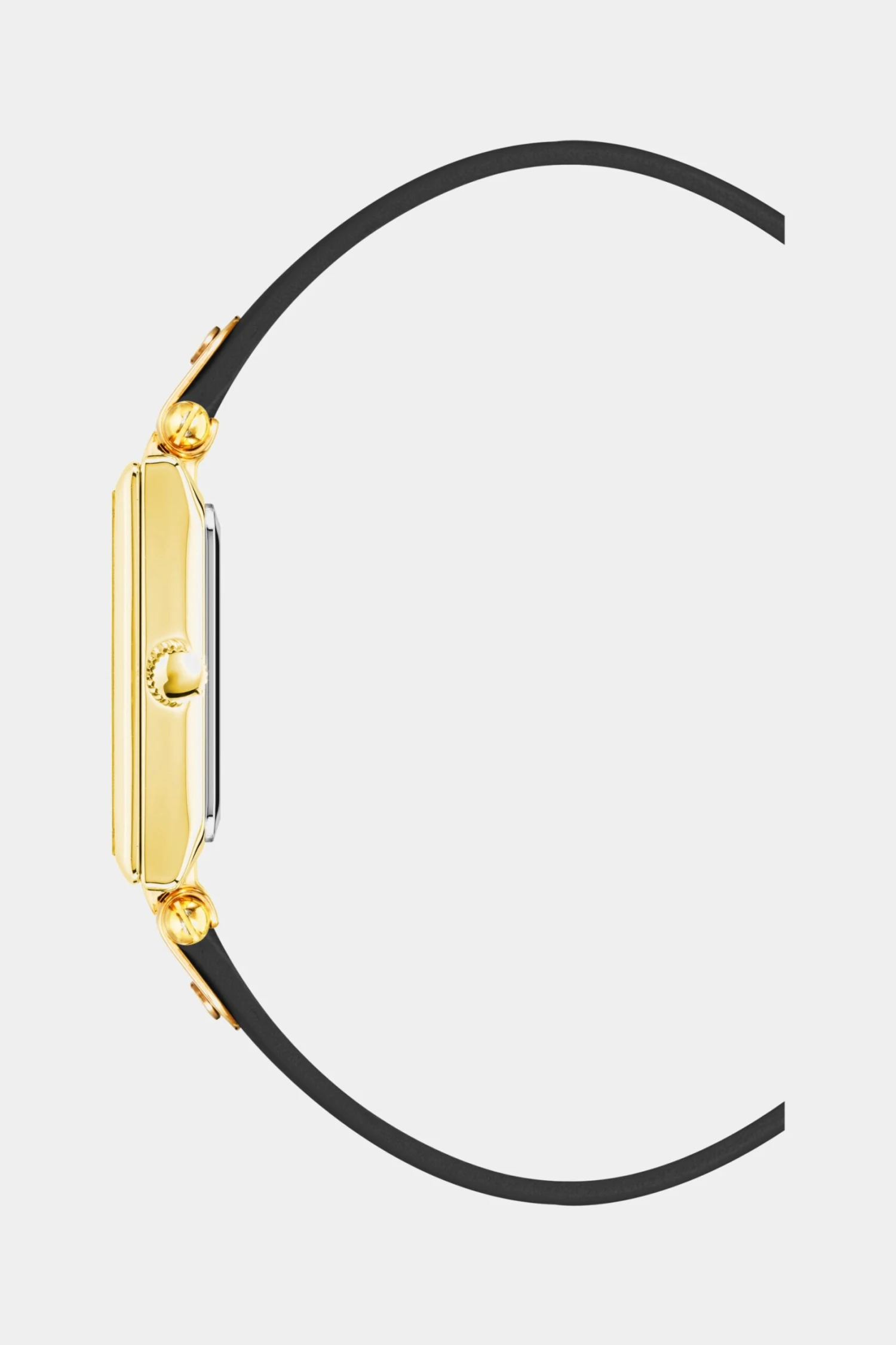 A sophisticated classic, this petite rectangular watch features a gold case and faux screw accents with a roman numeral dial and black leather strap.Â