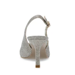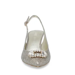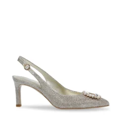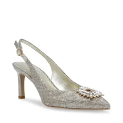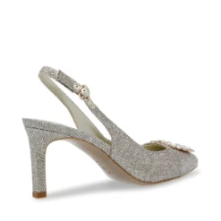 The classic slingback pump gets a refresh in all-over woven with a crystal buckle accent to remind us of its glamorous origins.