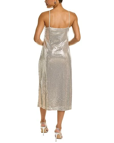 - Sequin Midi Dress in latte silver with sequin embellishments and V-neck