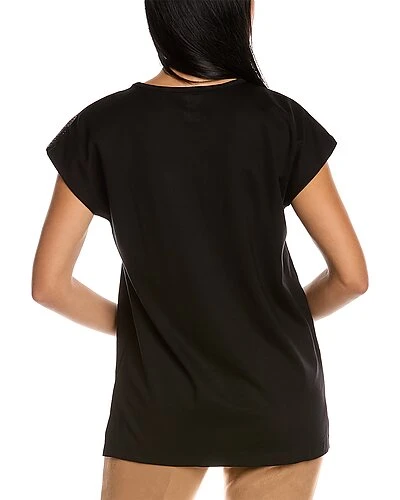 - Serenity Dolman T-Shirt in black with perforated faux leather front yoke and high-low hem