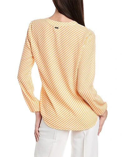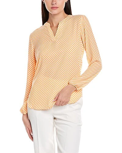 - Split Neck Blouse in tangelo and Anne white with elasticized cuffs and high-low hem