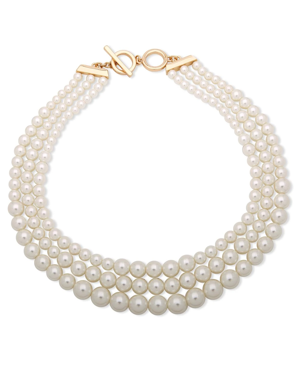 Give your V-neck blouses and off-shoulder dress a gorgeous upgrade with this three-strand necklace of shining faux pearls.