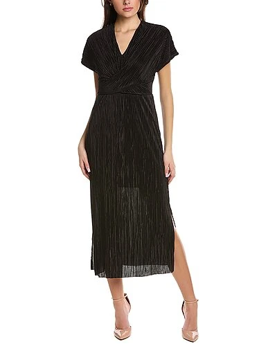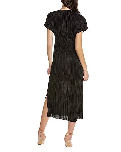 - Twist Front Midi Dress in black with accordion pleat texture and surplice top