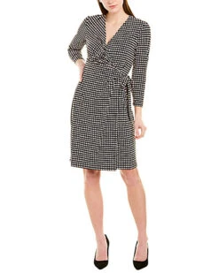 - Design details: surplice bust, 3/4-length sleeves, self-tie sash at left waist
